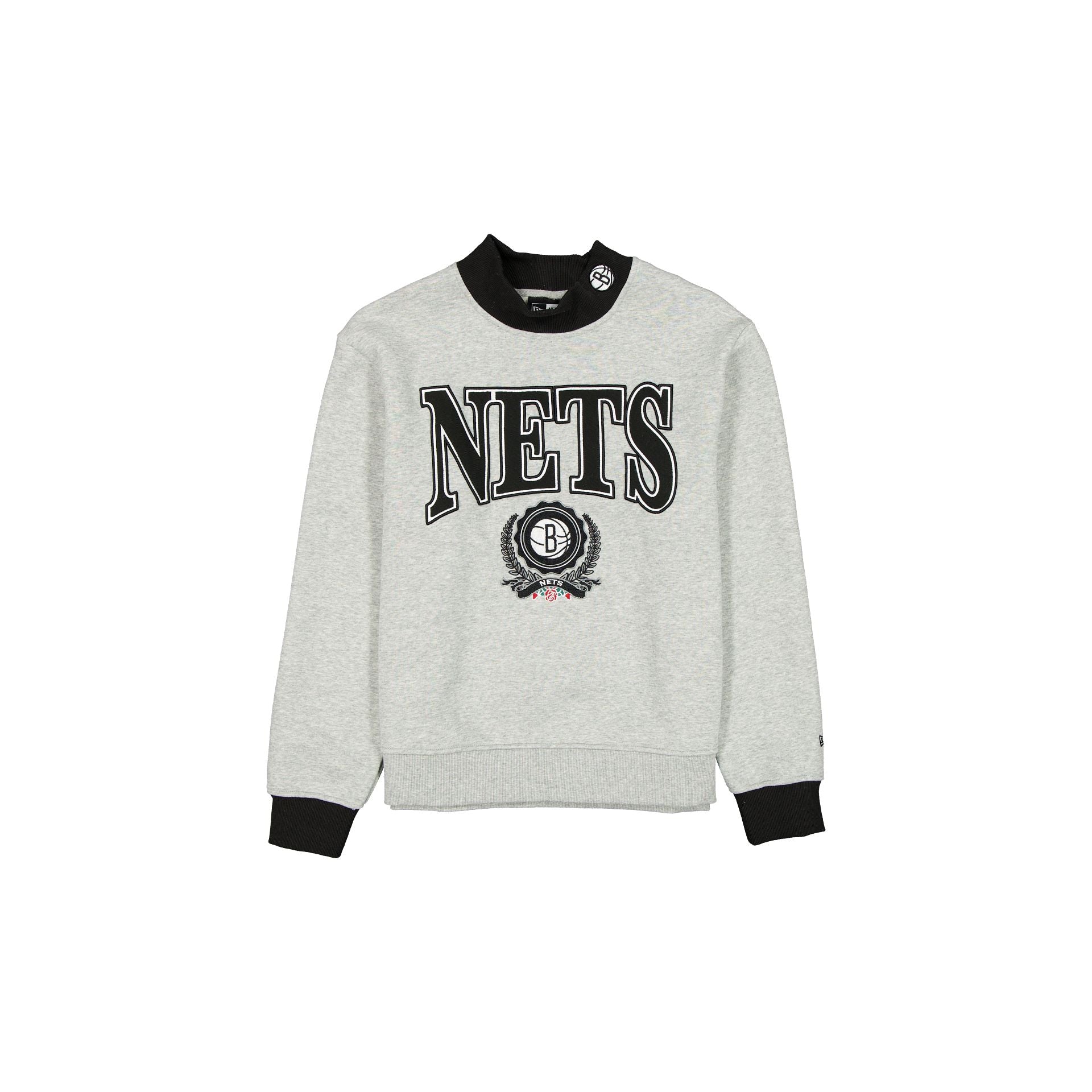 The Brooklyn Nets Throwback Prep Women’s Mockneck Sweatshirt features an embroidered Nets wordmark above a team emblem at the front with a matching logo at the neckline.