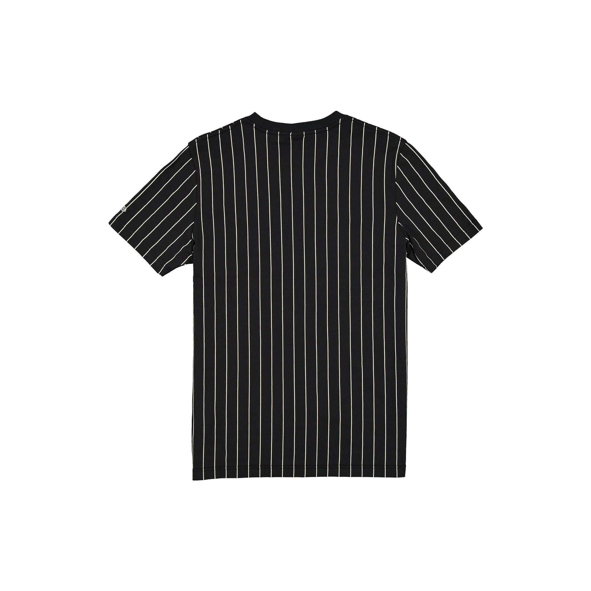 The Chicago Blackhawks Throwback Pinstripe Wordmark T-Shirt features a twill applique Blackhawks wordmark and logo at the front with a New Era jock tag at the left hip.