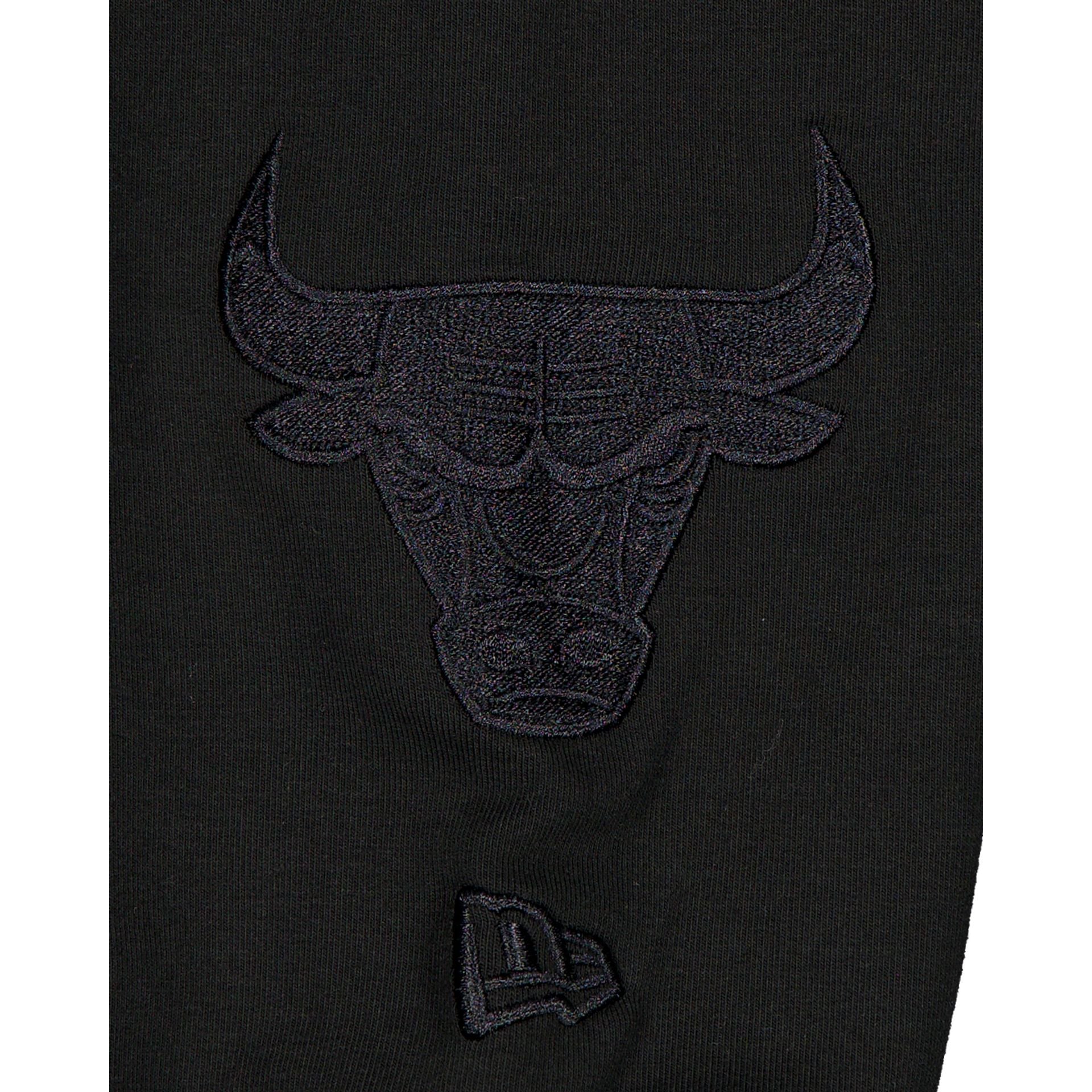 The Chicago Bulls Black on Black Logo Select Hoodie features a satin applique with a tonal stitch Bulls wordmark at the chest and an embroidered team logo at the left-wear sleeve.