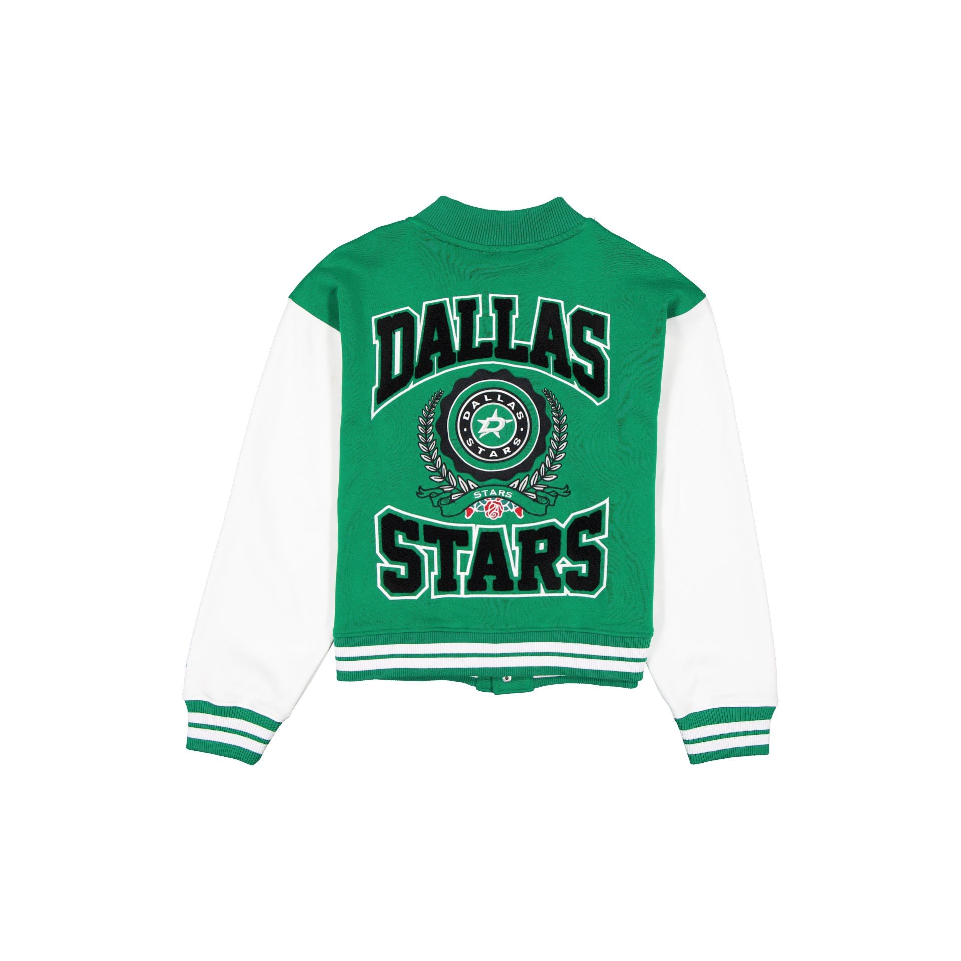 The Dallas Stars Throwback Prep Women’s Jacket features a chain-stitched Stars script at the left chest with a snap front closure and a chenille applique wordmark with team emblem at the rear.