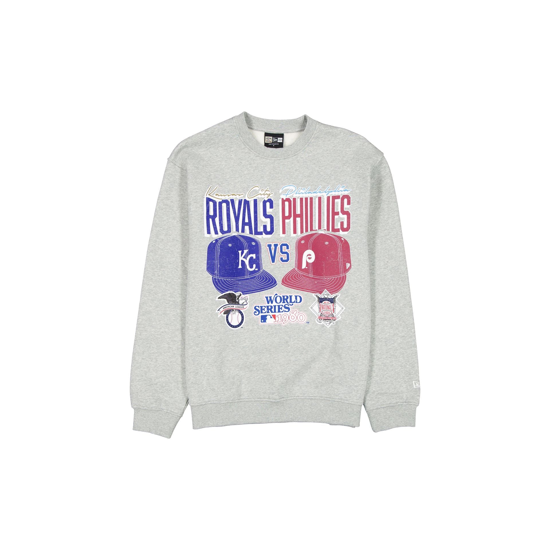 The MLB 1980 World Series Sport Classics Gray Crewneck features a dueling screen-printed Philadelphia Phillies and Kansas City Royals graphic at the front.