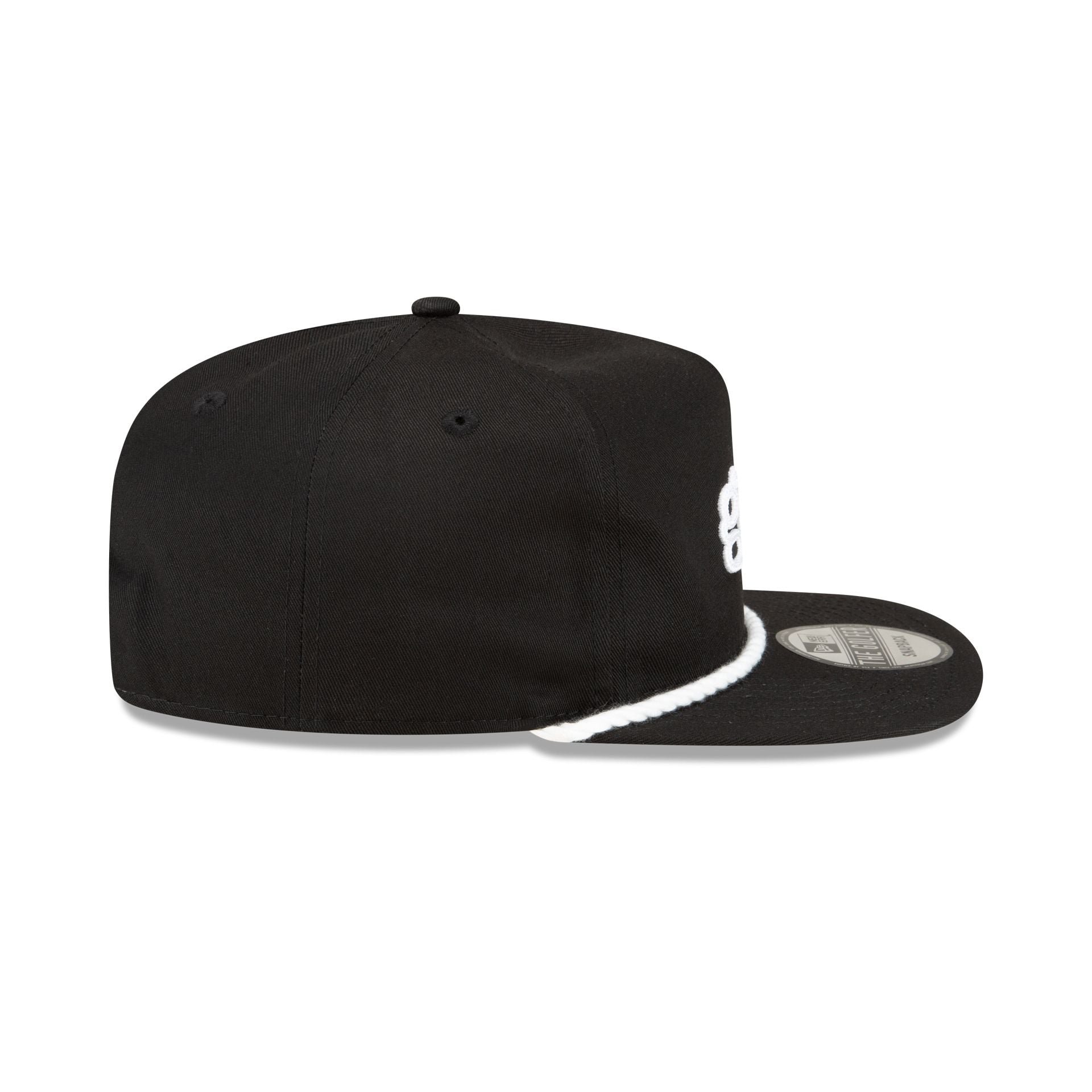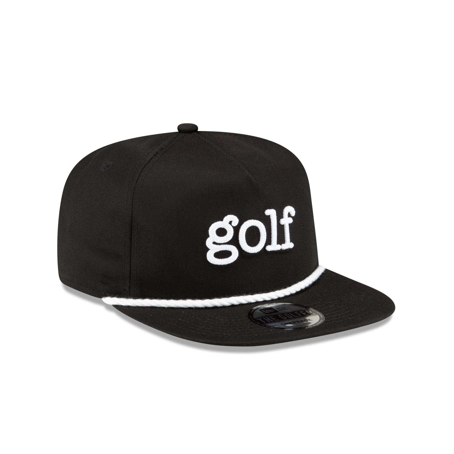 The New Era Golf Black Golfer features an embroidered golf text at the front panels with a New Era Golf logo above a snapback closure at the rear and a gray undervisor.