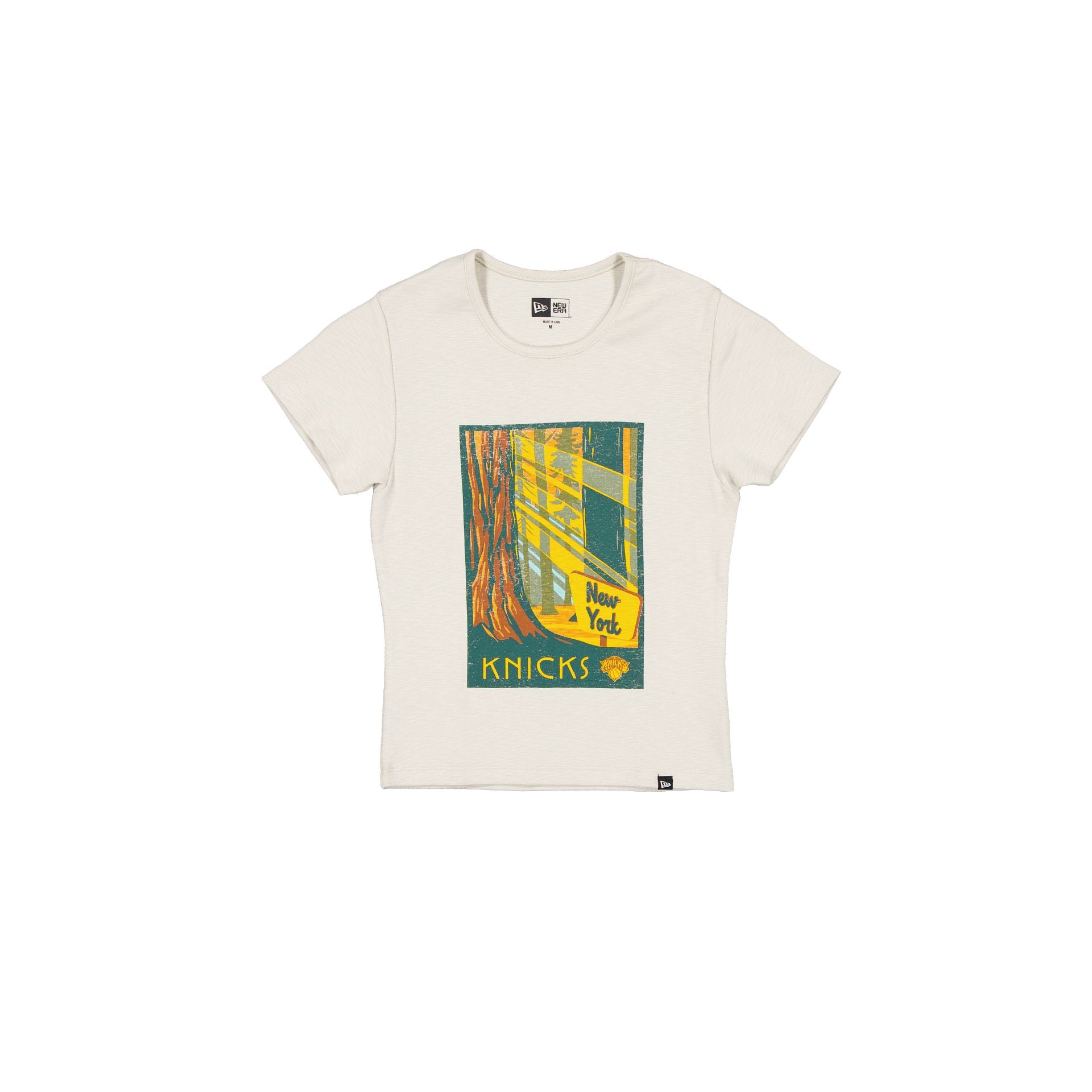The New York Knicks 2025 All-Star Game Victory Grove Women’s Stone T-Shirt features a screen-printed Knicks forest graphic at the front.