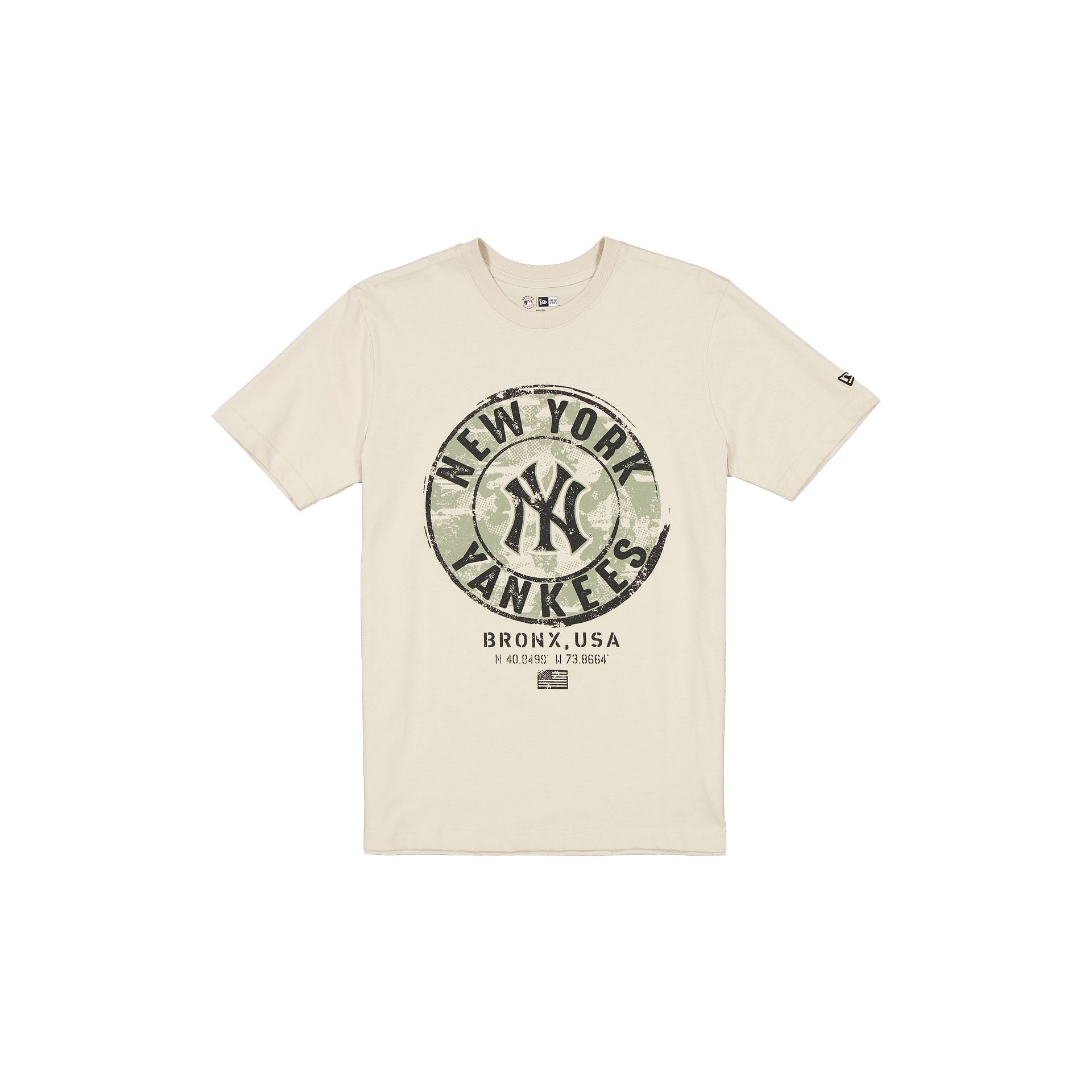 The New York Yankees Armed Forces Day 2025 Stone T-Shirt features a screen-printed Yankees graphic at the front.