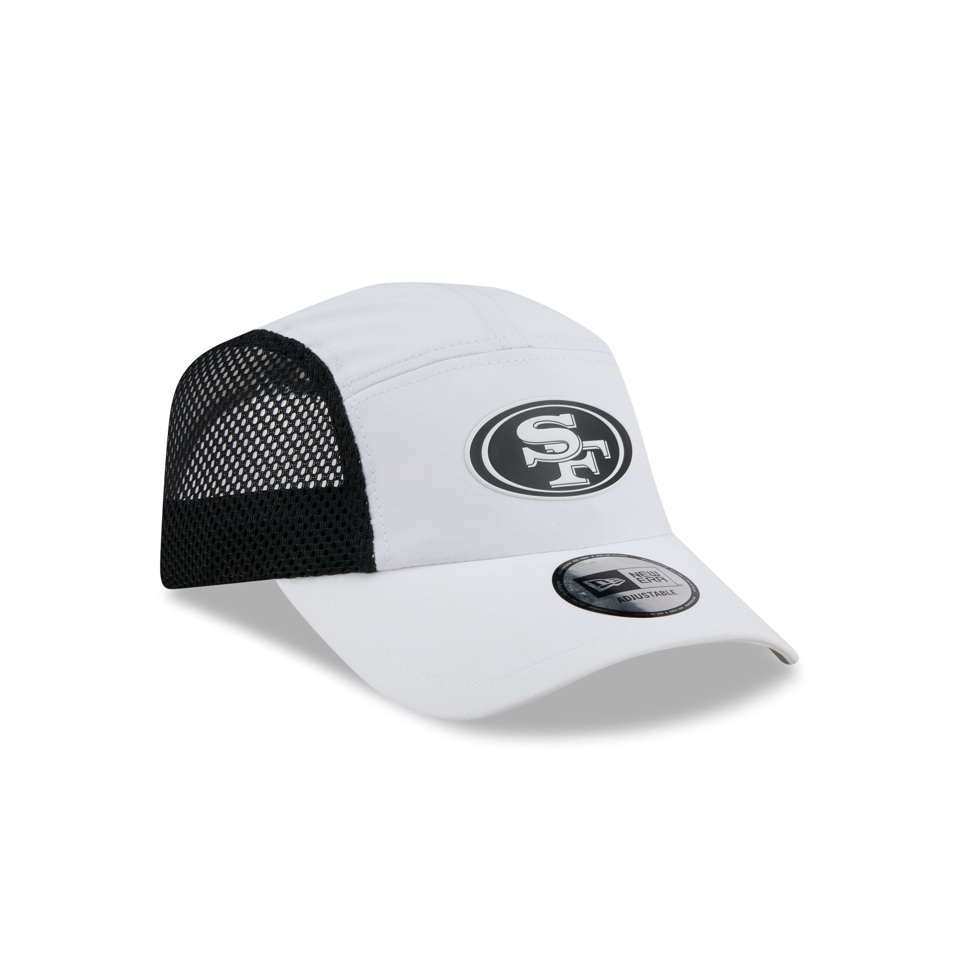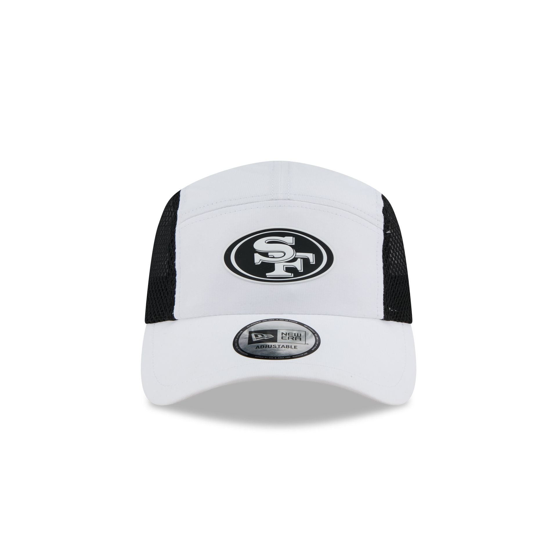 The San Francisco 49ers White Poly Runner Cap features a heat sealed 49ers logo at the front panels with mesh side panels. Additional details include a silicone patch above an adjustable drawstring closure at the rear.