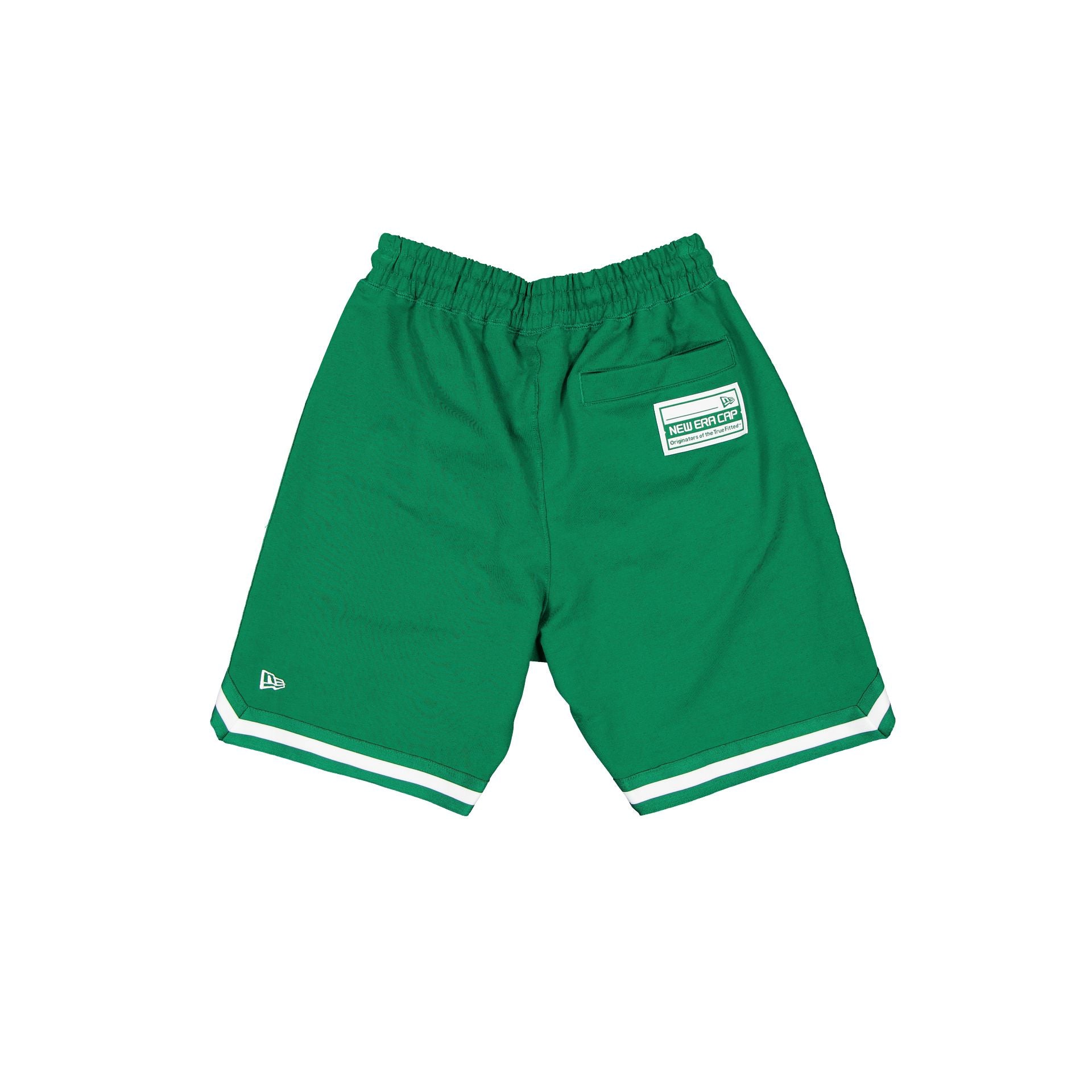 The Boston Celtics Team Color Logo Select Shorts features an embroidered Celtics logo at the right leg with a matching team wordmark at the left leg and a New Era Cap jock tag at the rear pocket.