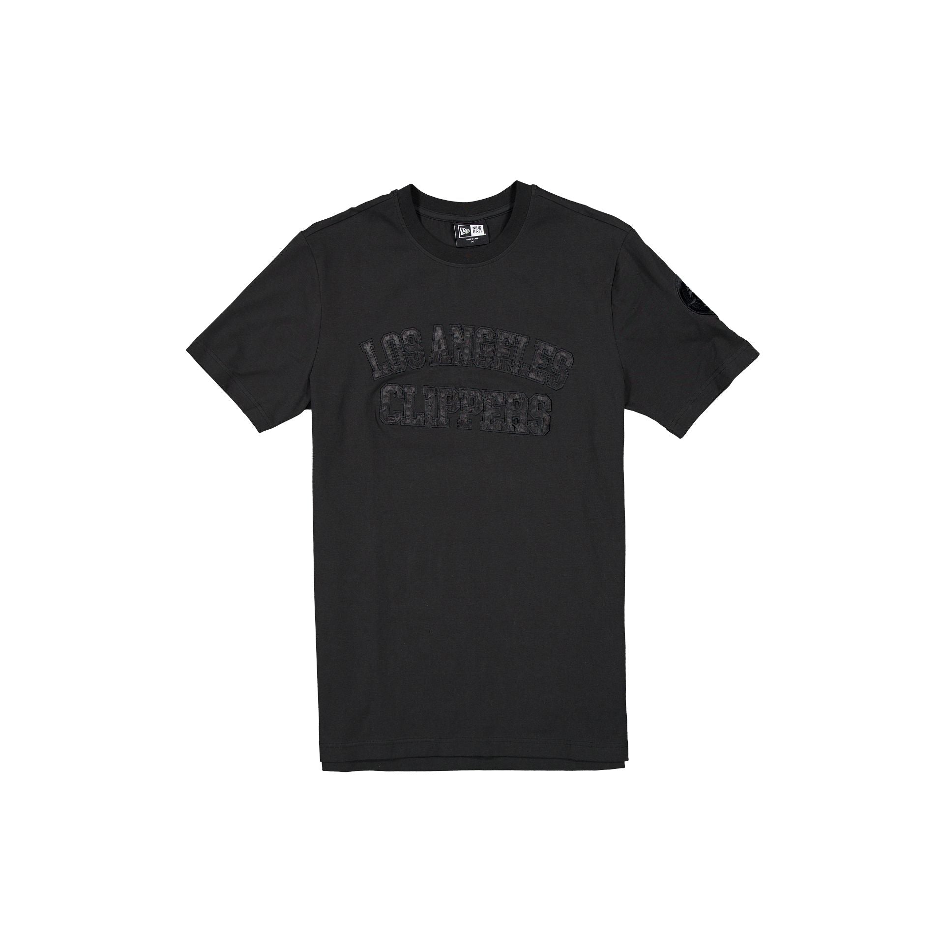 The Los Angeles Clippers Black on Black Logo Select T-Shirt features a satin applique with a tonal stitch Clippers wordmark at the chest and an embroidered team logo at the left-wear sleeve.
