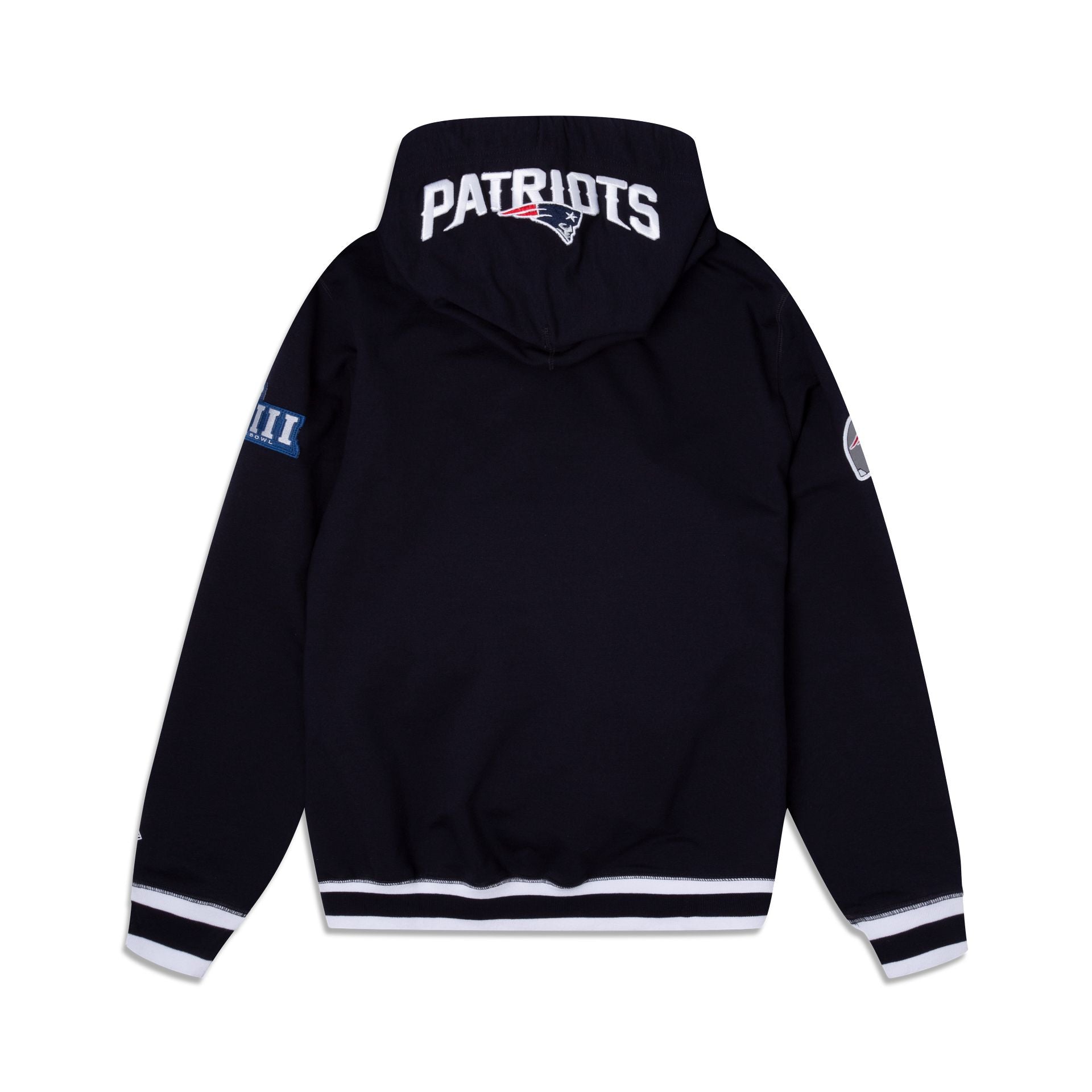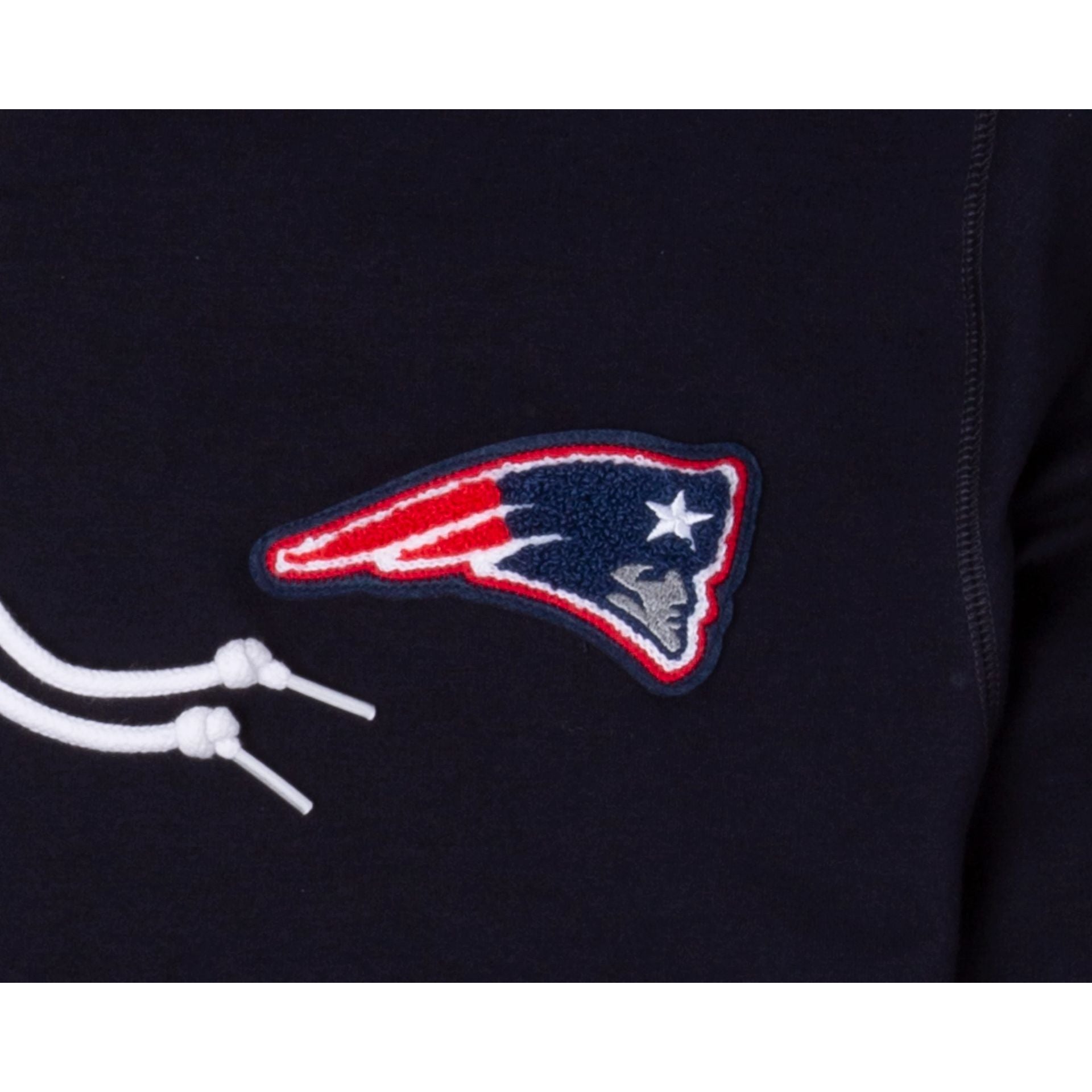 The New England Patriots Logo Select Hoodie features a chenille applique Patriots logo at the left chest with team patches at each sleeve and an embroidered team wordmark at the hood.